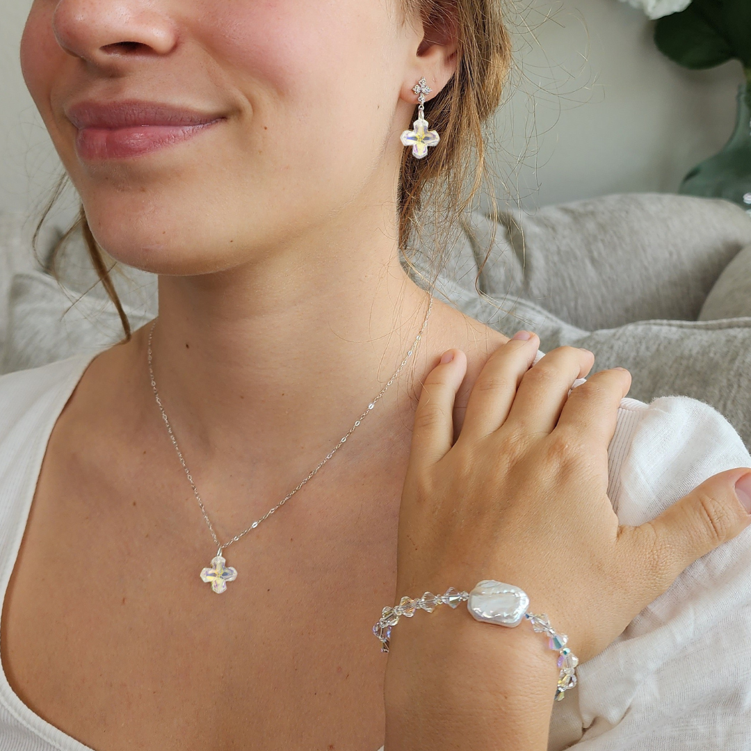 This set beautifully matches The Child of God Gracelet, which features the same Swarovski crystal cross in the Silver Night color. Model is also wearing the River of Gladness Bracelet.