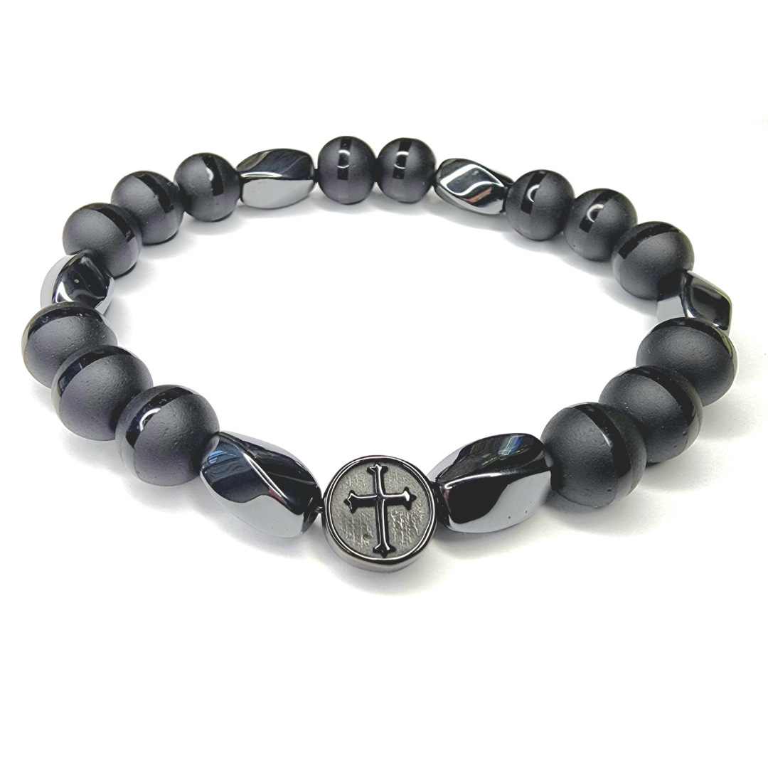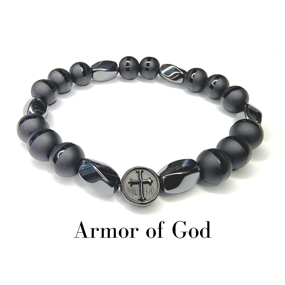 पुरुषों, हम एक लड़ाई में हैं! हर दिन परमेश्वर के पूरे कवच को पहनकर युद्ध के लिए तैयार रहें। यह कलाई कवच आध्यात्मिक रूप से तैयार होने की याद दिलाता है। हेमेटाइट का प्रत्येक टुकड़ा कवच का प्रतिनिधित्व करता है: सत्य की बेल्ट, धार्मिकता का कवच, शांति के सुसमाचार से सुसज्जित पैर, विश्वास की ढाल, आत्मा की तलवार और उद्धार का हेलमेट।