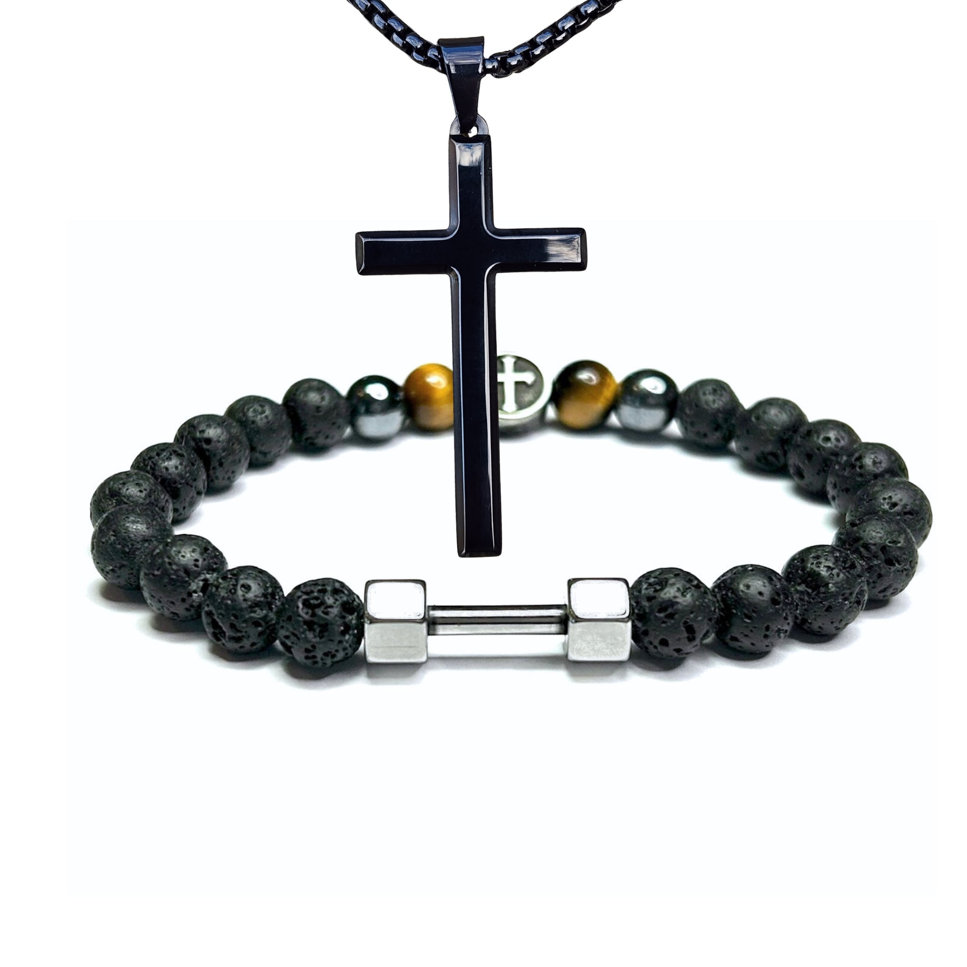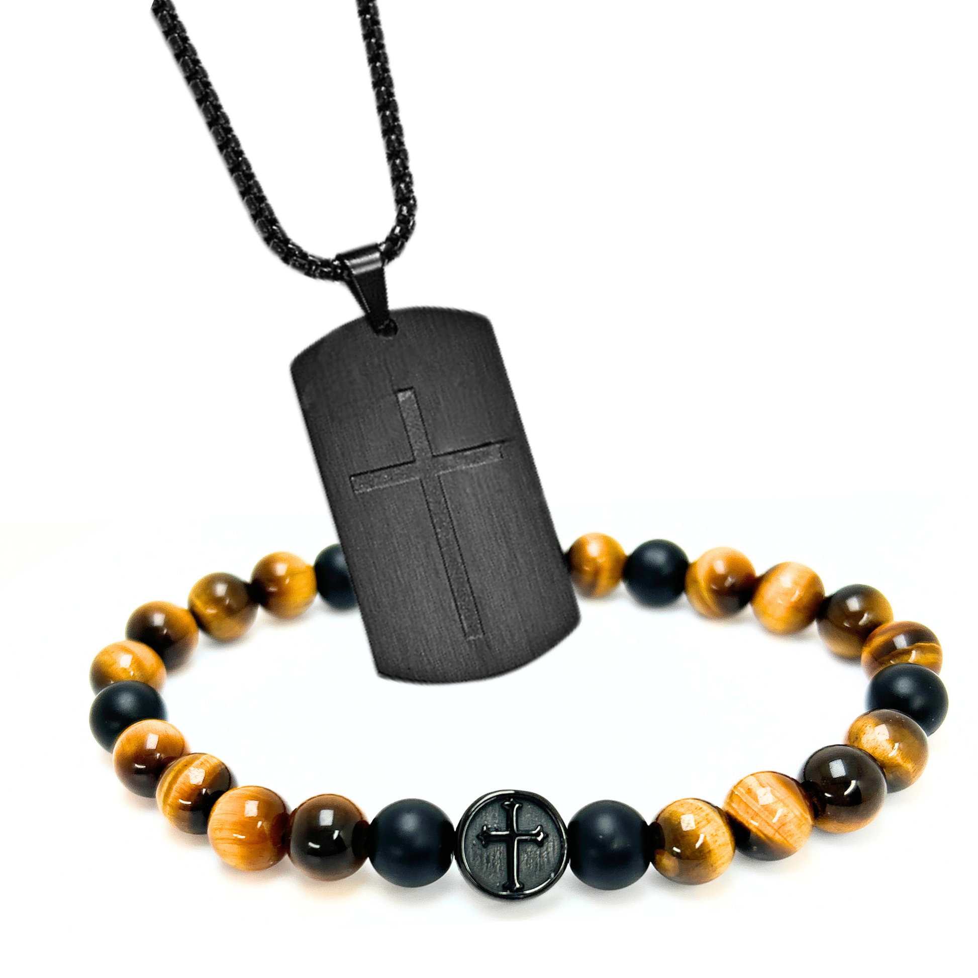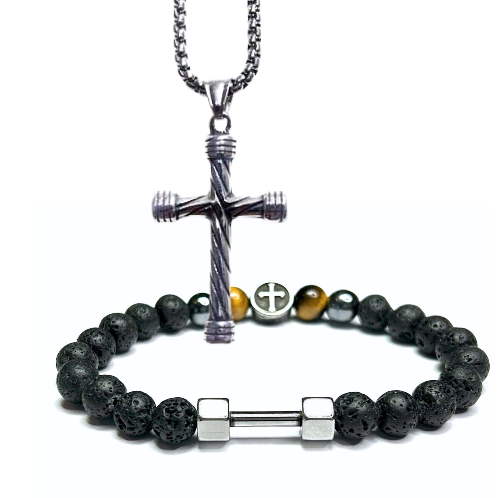 A bracelet and cross designed to be worn together as faith-based men's jewelry for daily wear.
