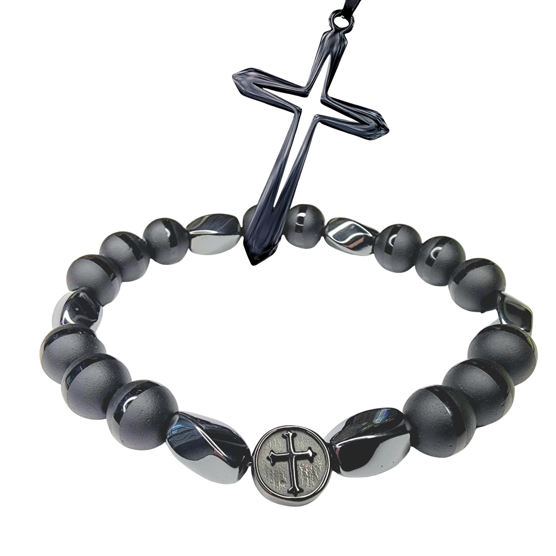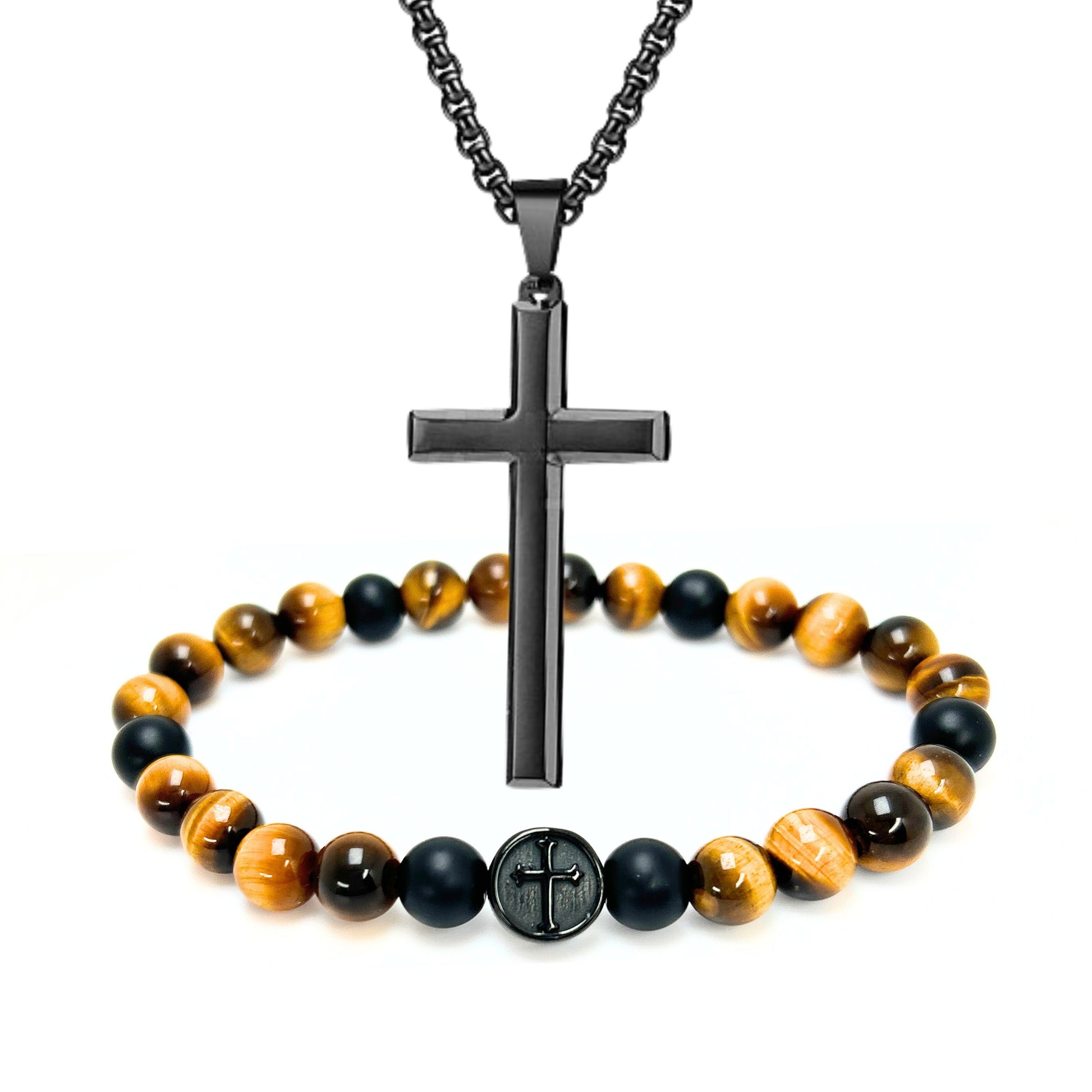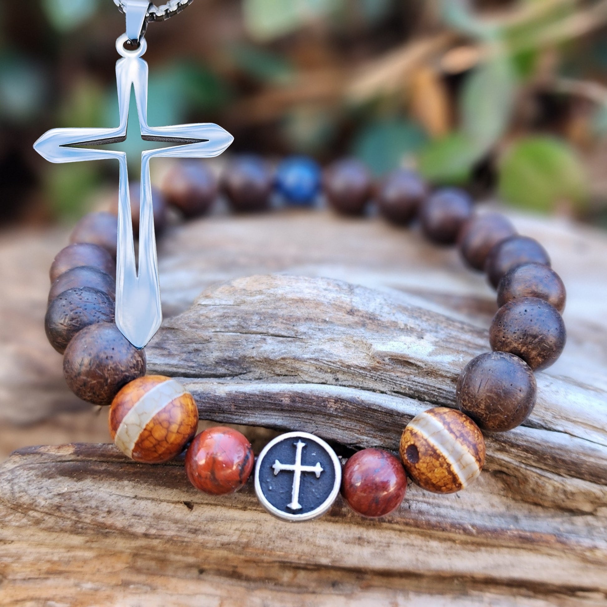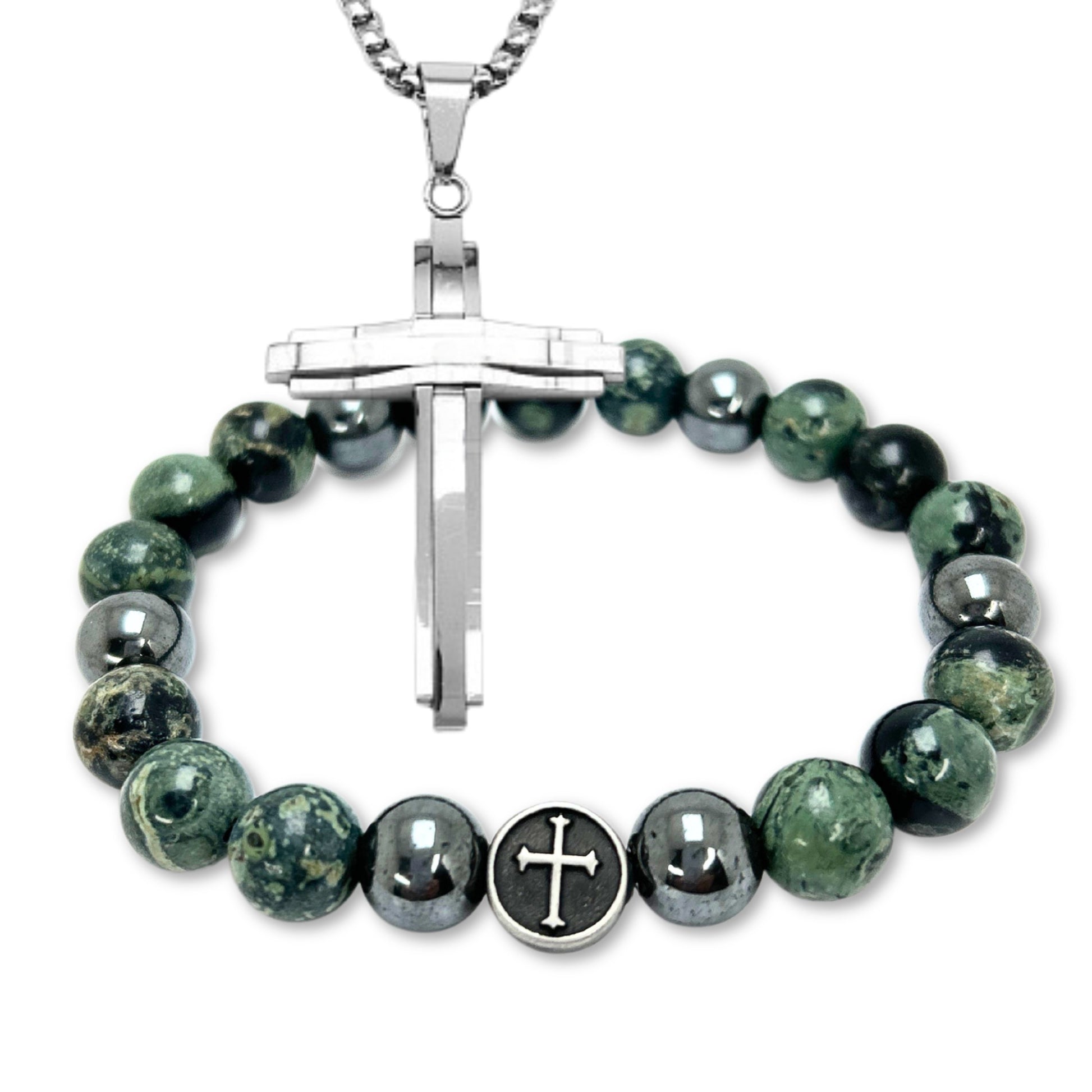 A bracelet and cross designed to be worn together as faith-based men's jewelry for daily wear.