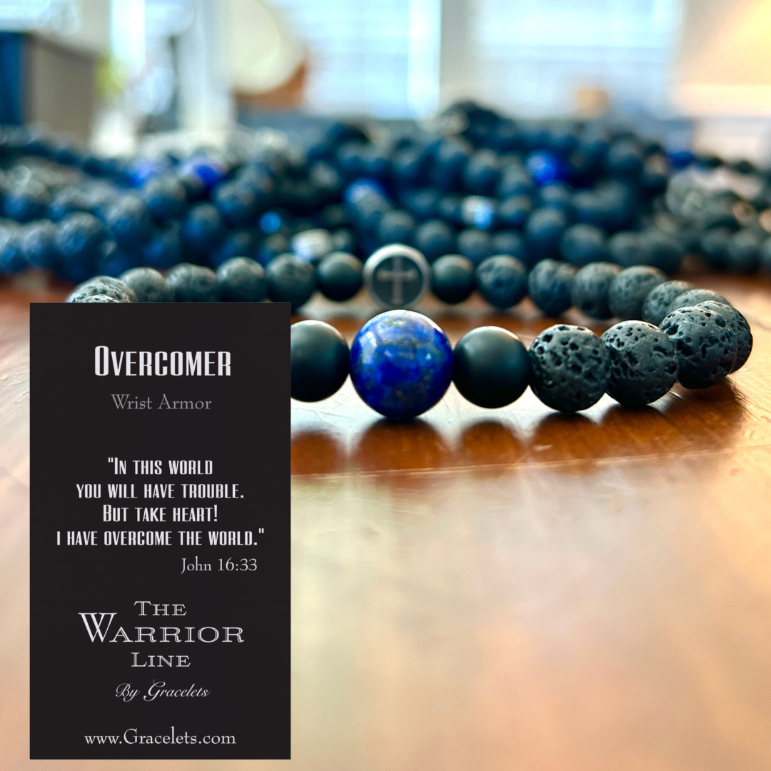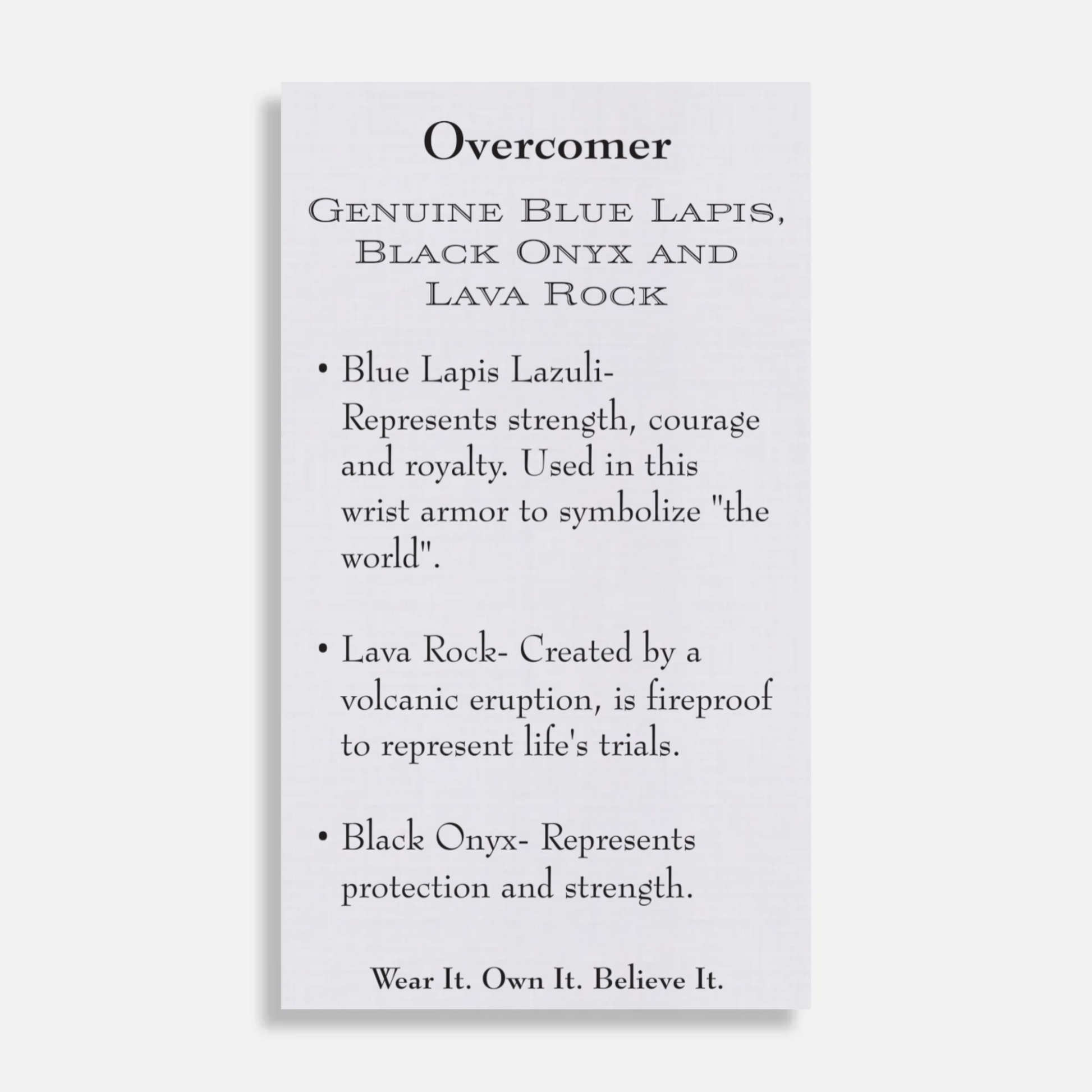 कोई भी व्यक्ति संघर्ष के बिना नहीं रहा है। यह कलाई कवच सभी समय के सबसे महान कमांडर इन चीफ, यीशु के वादे का प्रतिनिधित्व करने के लिए बनाया गया था। उसने दुनिया पर विजय प्राप्त की है (10 मिमी नीला लैपिस ग्लोब)। वह पहले ही युद्ध जीत चुका है। इस वजह से, हम जीवन के विस्फोटों (8 मिमी लावा रॉक) के बीच शांति पा सकते हैं।