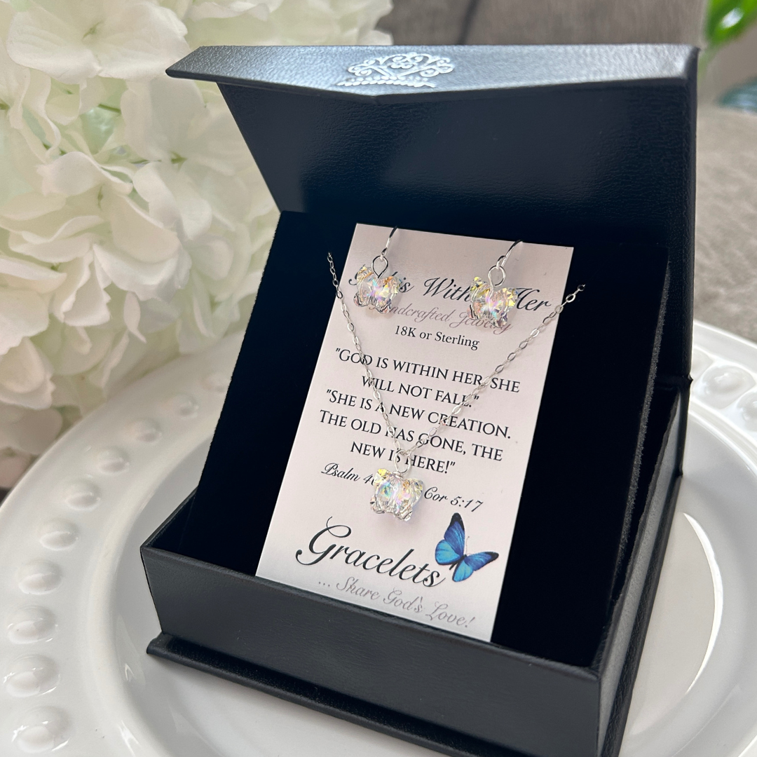 Celebrate who you are - This set is your personal testimony of grace, growth and renewal! Inspired by the powerful messages of Psalm 46:5 and 2Corinthians 5:17, this Swarovski crystal butterfly set is a wearable reminder of your strength and transformed new life. "The old has passed away; behold, the new has come!"