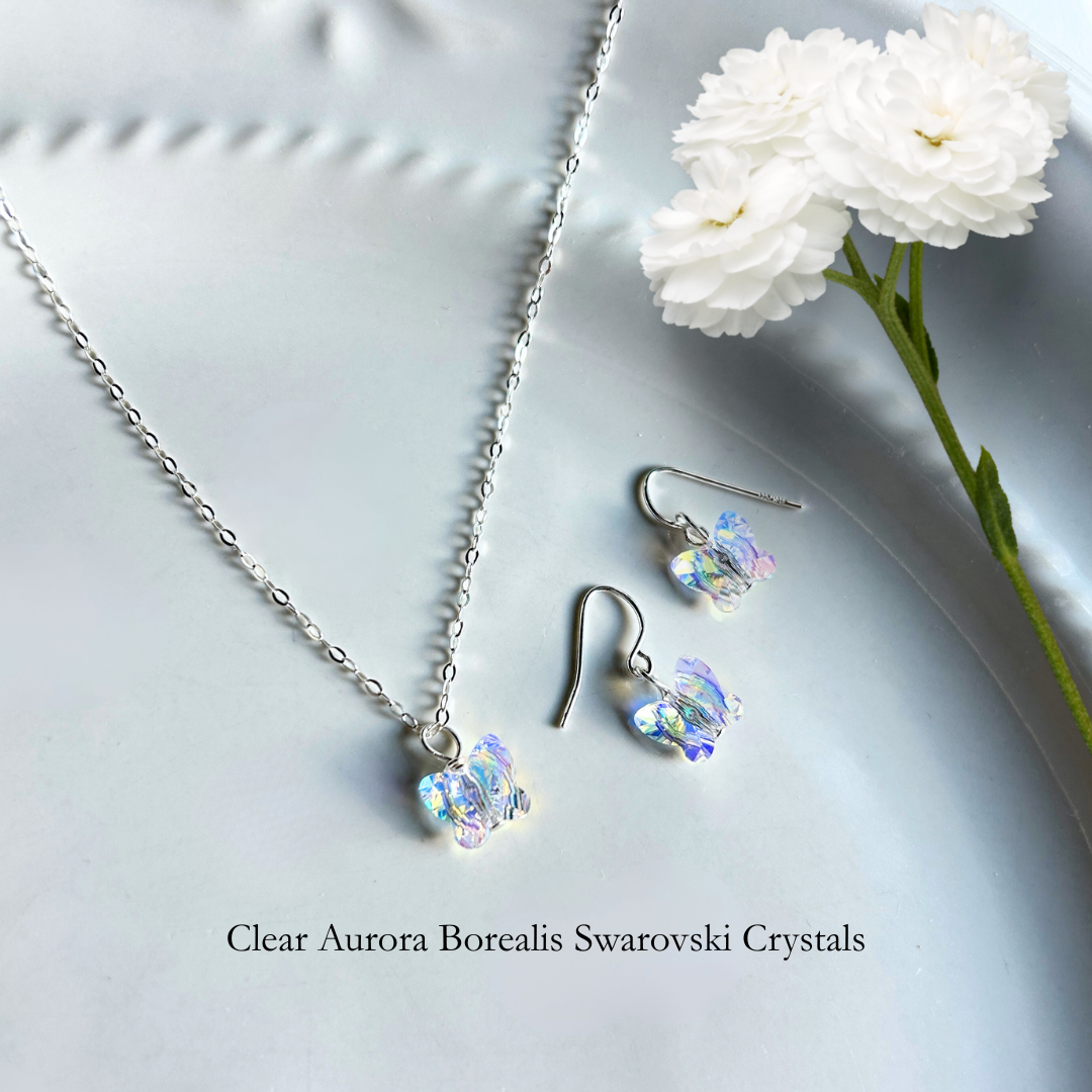 Necklace is Sterling Silver adjustable from 16.5-19" and earring length is 1" on Sterling Silver ear-wires. Crystal Butterflies measure a bit less than 1/2".