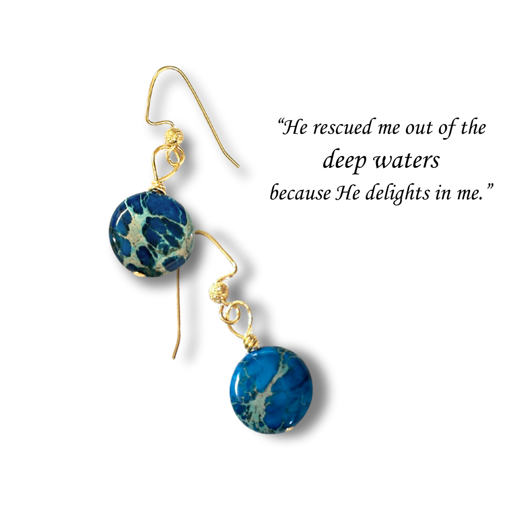 What better gemstone than Sea Sediment Jasper to symbolize this verse! Your heavenly Father reached down and pulled you out of the deep, turbulent waters and drew you to Himself. His love broke open the way and rescued you into His steadfast, eternal presence. Why? Because He delights in you!