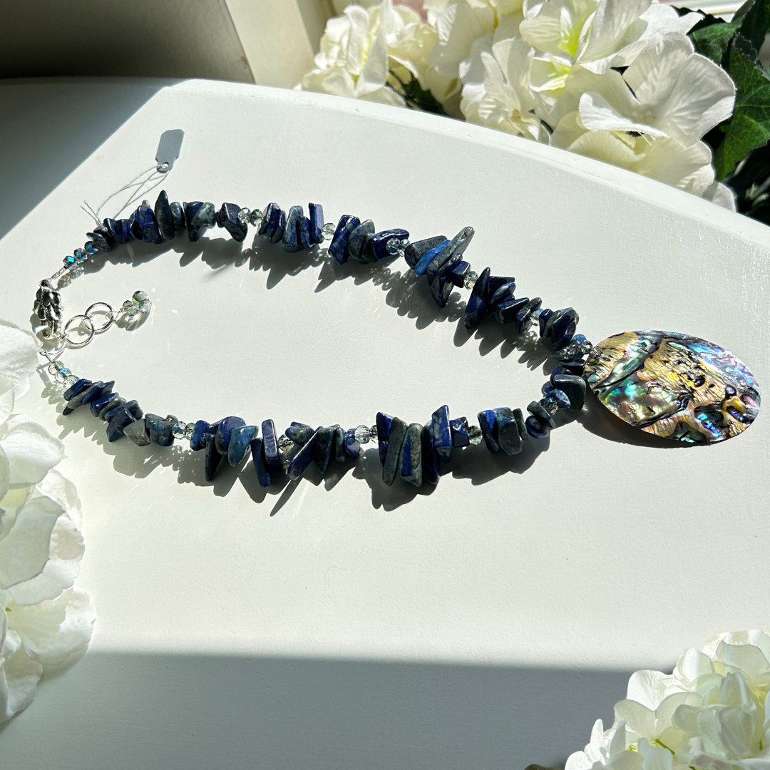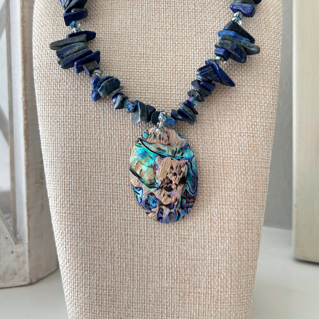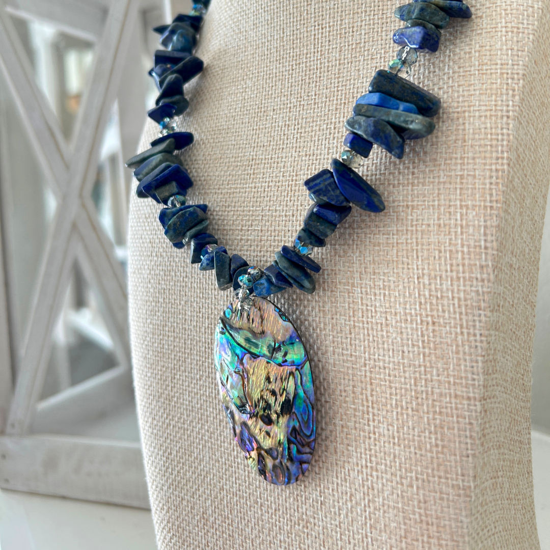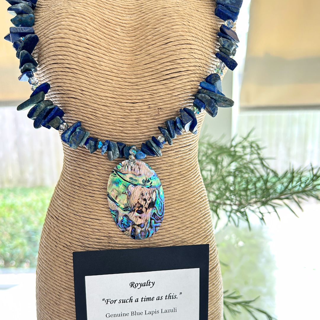 This statement necklace features genuine Blue Lapis Lazuli stones, mentioned many times in scripture, with a stunning genuine Abalone focal, and glittering with intermittent Swarovski crystals for flair. Blue Lapis is truly a royal gemstone. It is one of the stones in the wall of heaven and the breastplate, and believed to be the stone that the ten commandments were written upon. Truly a royal display!