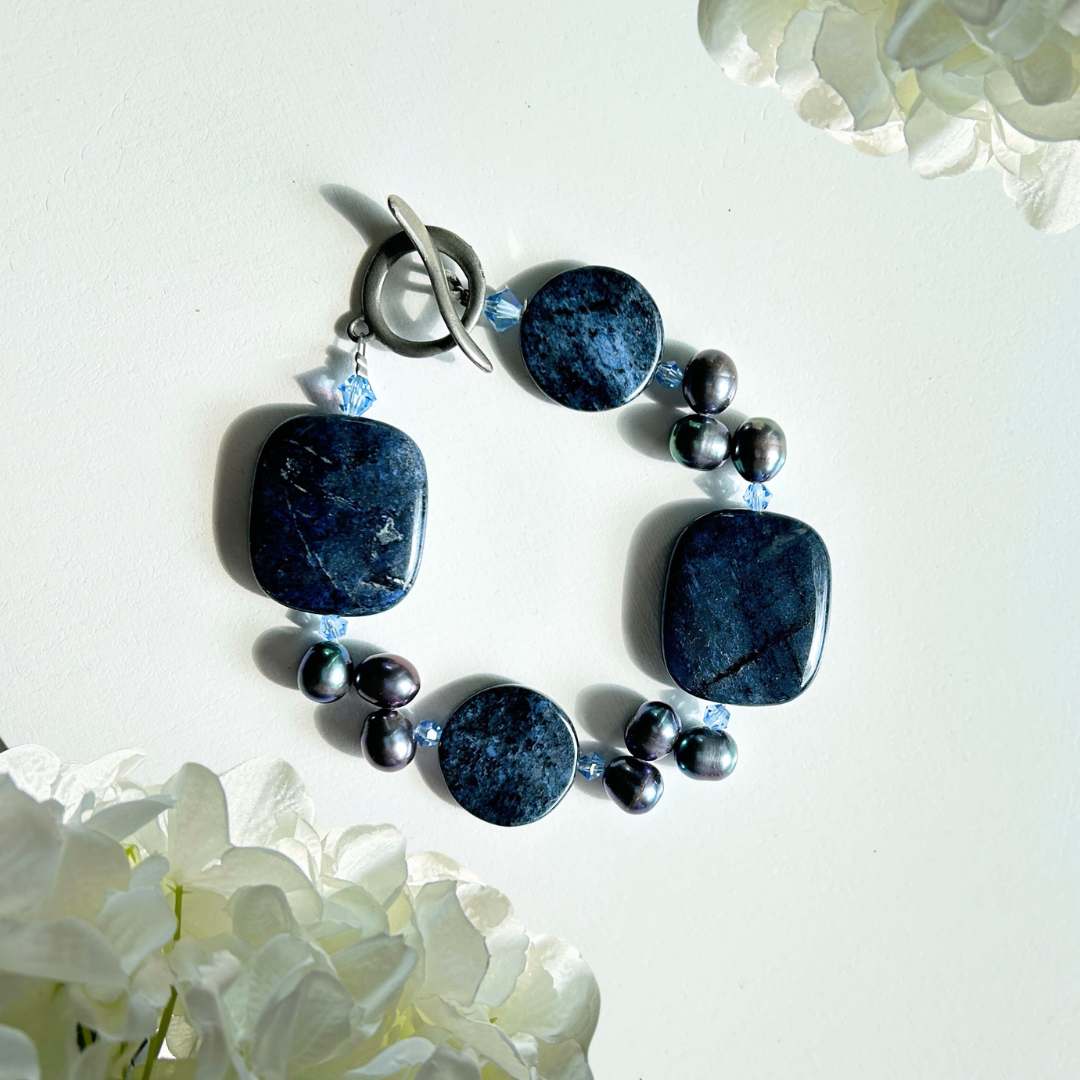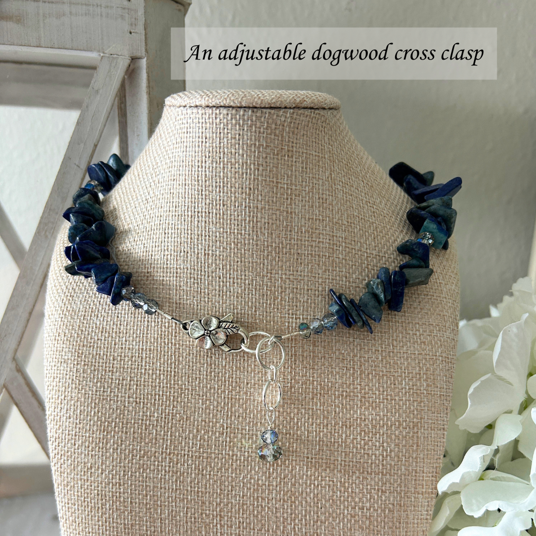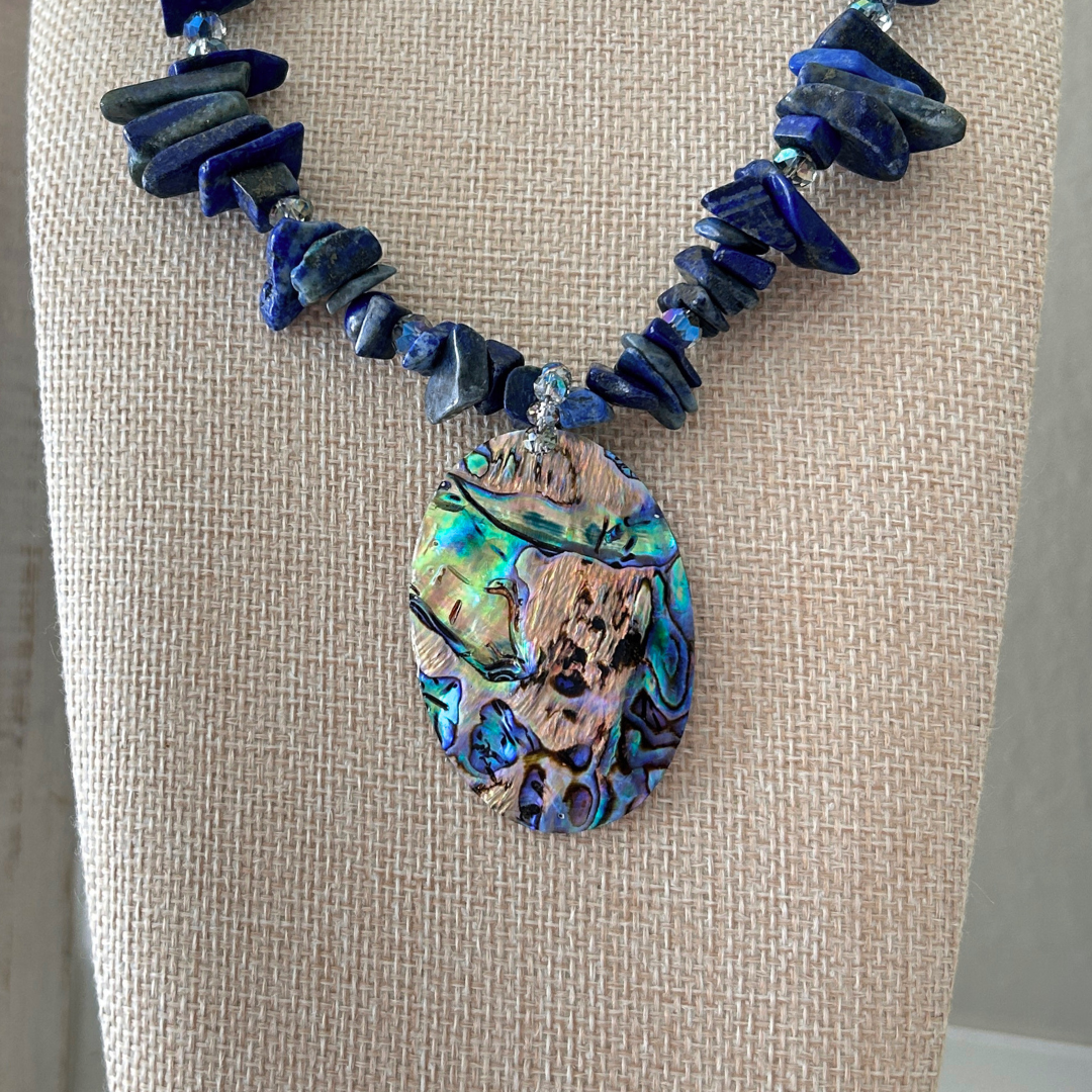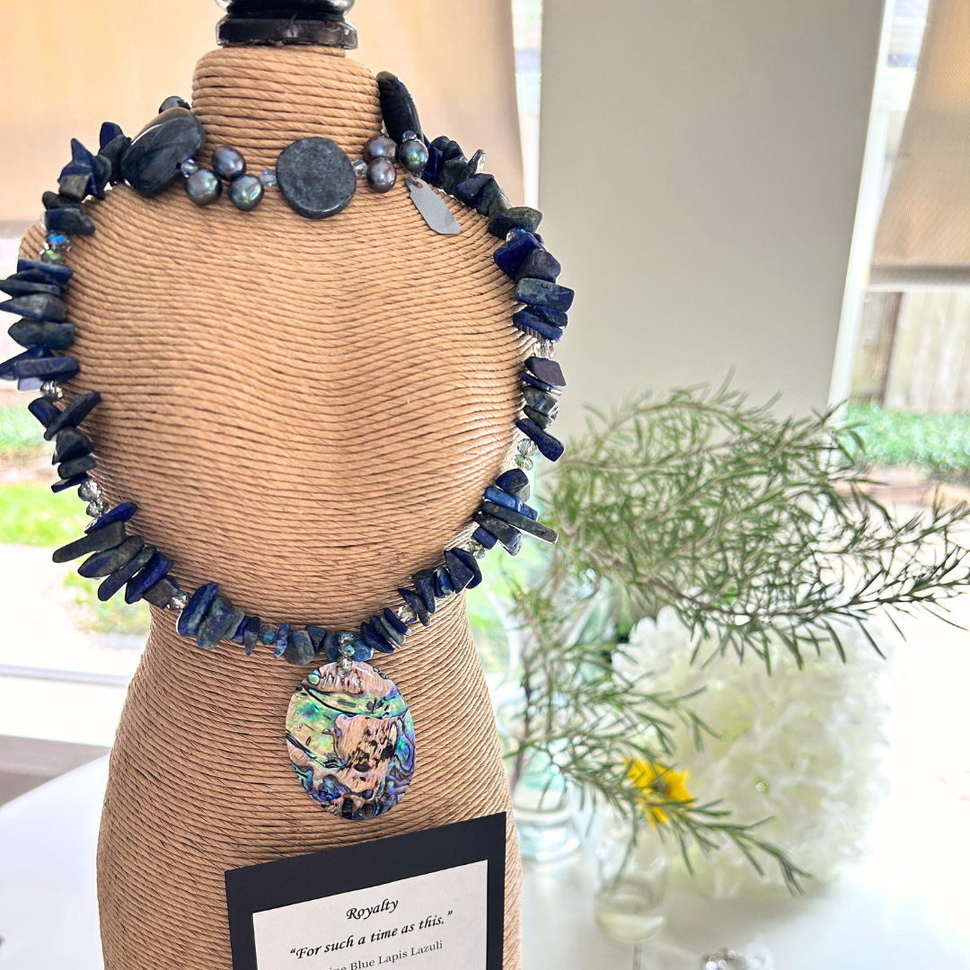 This statement necklace features genuine Blue Lapis Lazuli stones, mentioned many times in scripture, with a stunning genuine Abalone focal, and glittering with intermittent Swarovski crystals for flair. Blue Lapis is truly a royal gemstone. It is one of the stones in the wall of heaven and the breastplate, and believed to be the stone that the ten commandments were written upon. Truly a royal display!