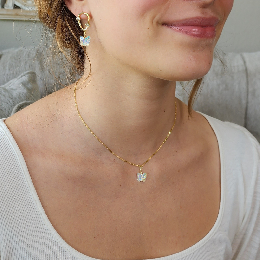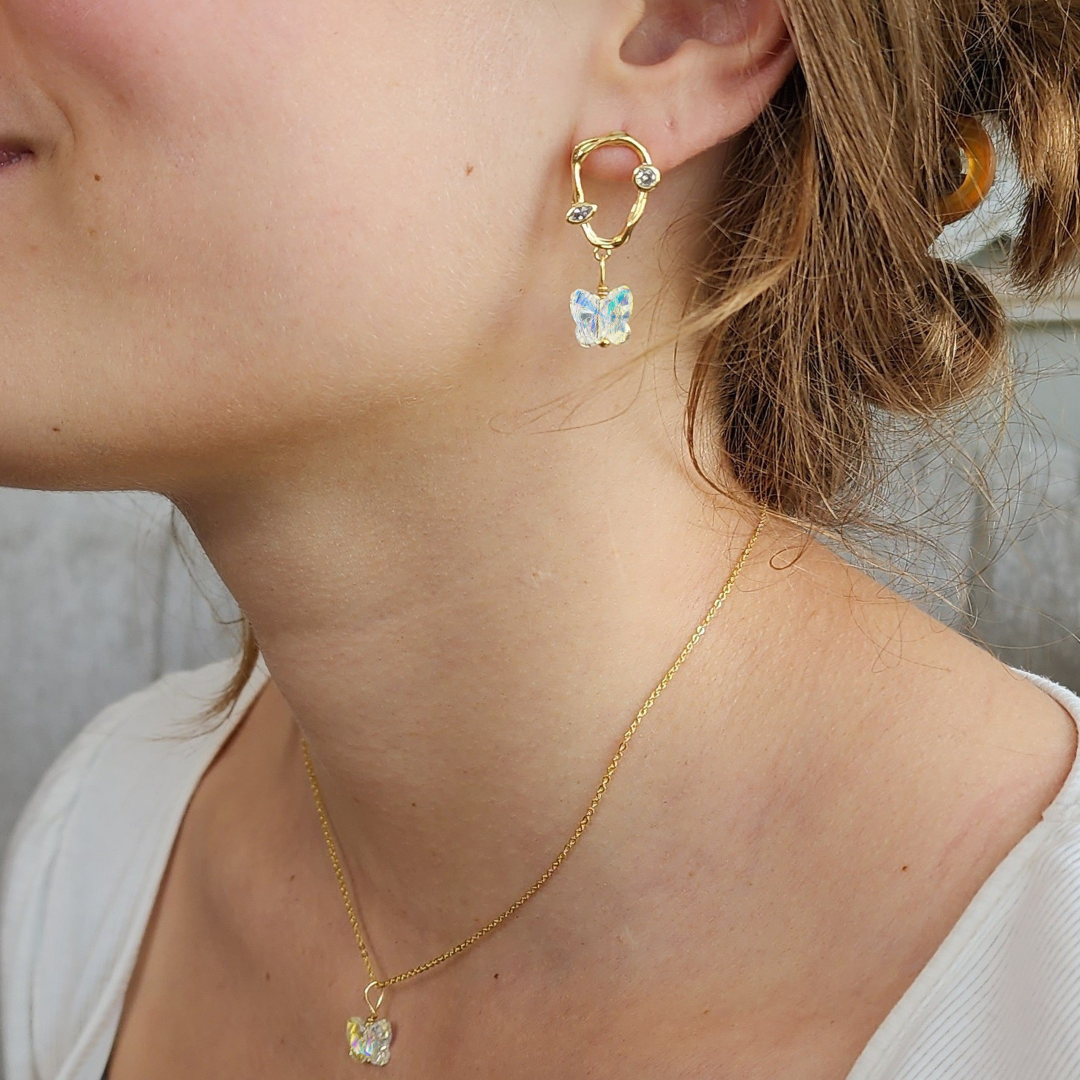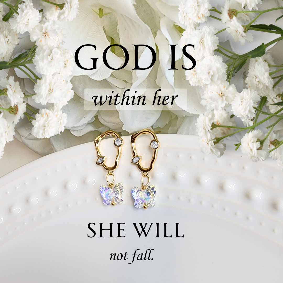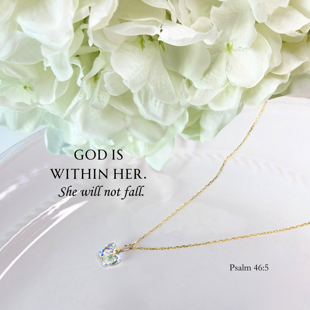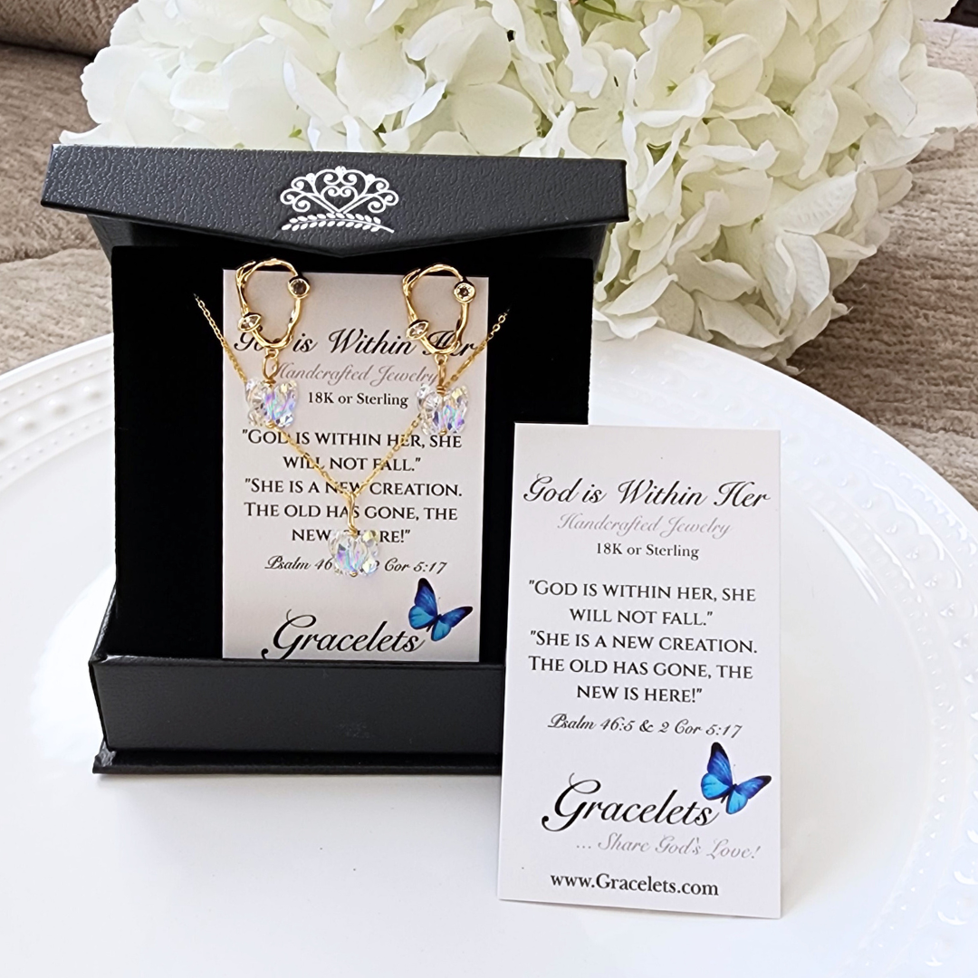 Inspired by the powerful message of Psalm 46:5, this butterfly jewelry set is a wearable reminder of God's strength within you. Crafted with authentic Swarovski crystal butterflies on 18K gold, you will welcome each day with a brilliance about you! For you are in Christ, and are a new creation, like a butterfly emerging from a cocoon. Strong, free, bold and empowered! Celebrate the unique and divine creation, that is you.