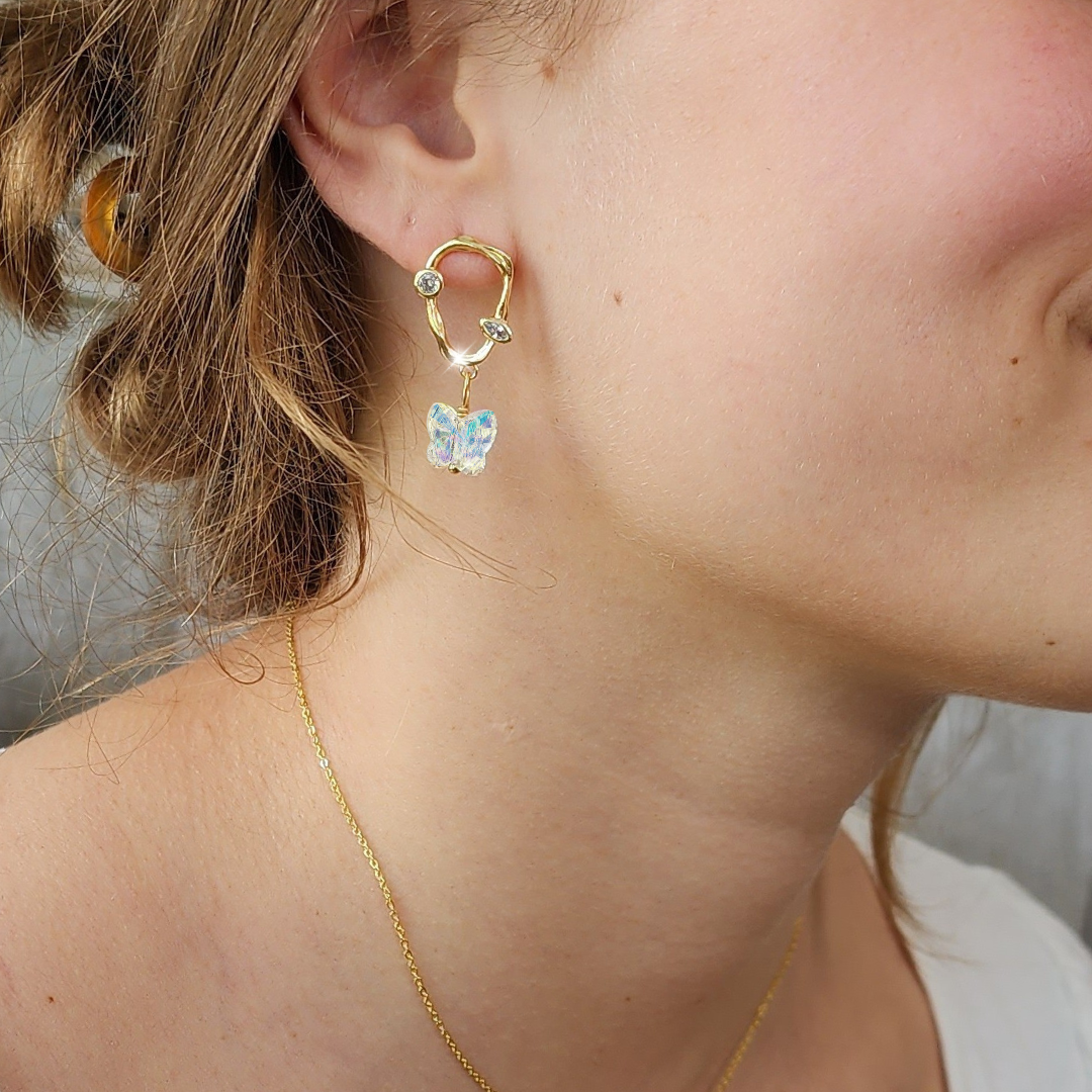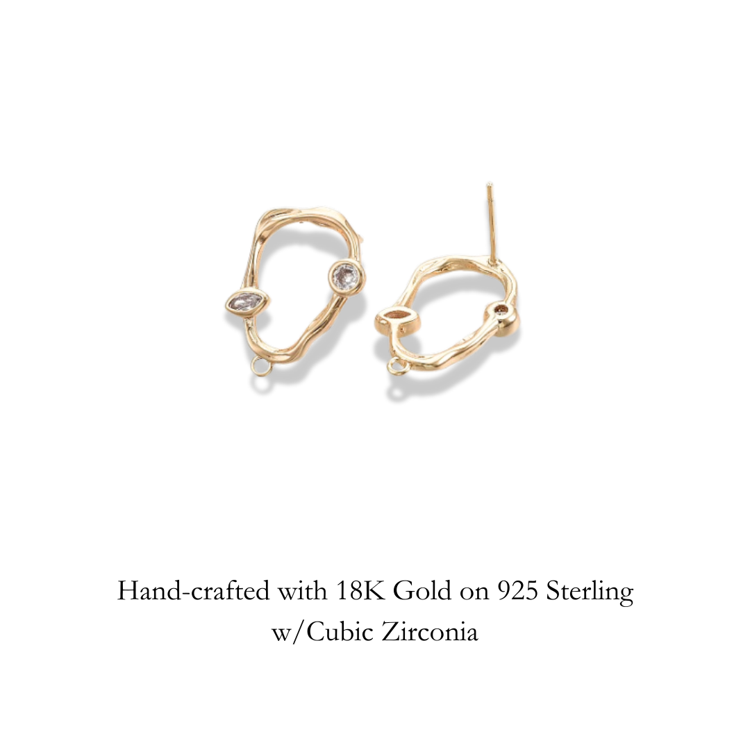 Sculptural 18K Gold Vermeil hoop earrings, crafted in a freeform, organic shape give a handcrafted, artistic appeal, complimenting the idea of fluttering butterflies perfectly. Each earring features bezel-set cubic zirconia stones - one round and one marquise adding more dance and sparkle to your day!