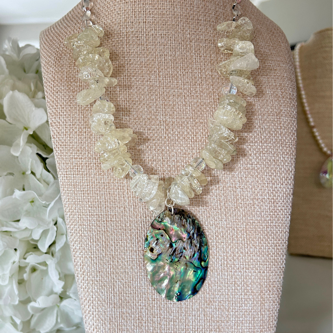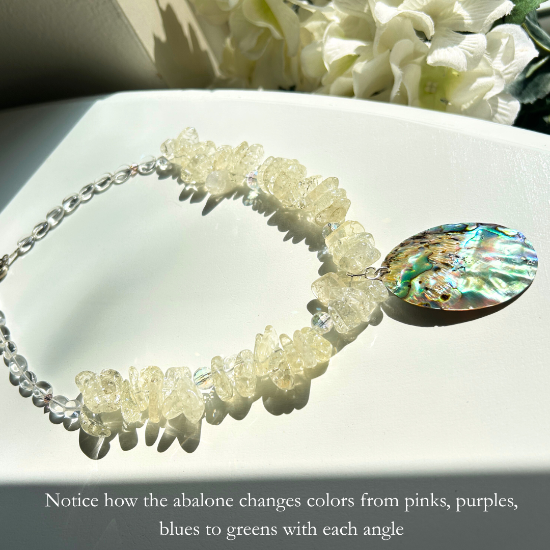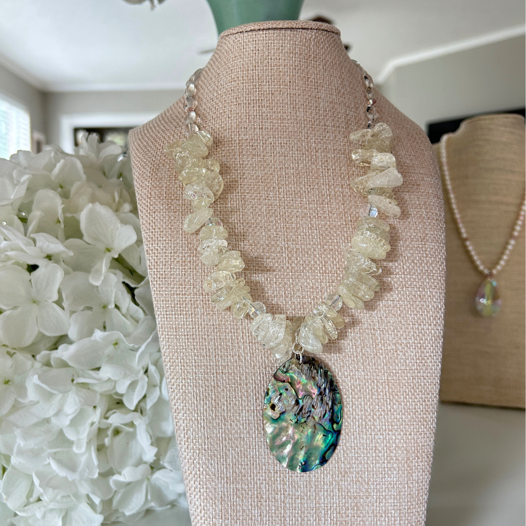 Genuine Quartz, Quartz Crystal with Abalone Shell on an adjustable clasp with a crystal dangle that makes the back of this necklace as beautiful as the front.