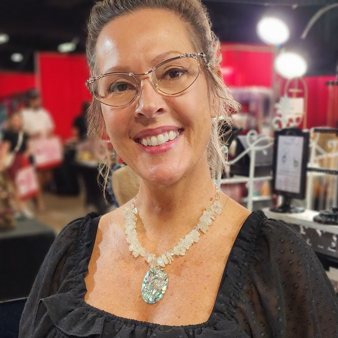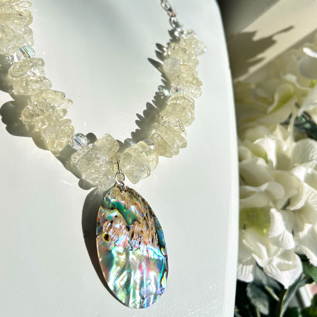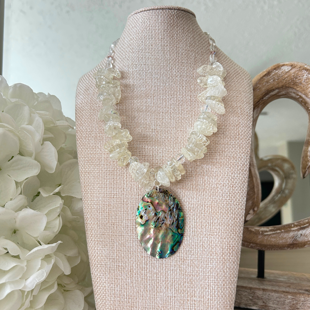 Genuine Quartz, Quartz Crystal with Abalone Shell on an adjustable clasp with a crystal dangle that makes the back of this necklace as beautiful as the front.